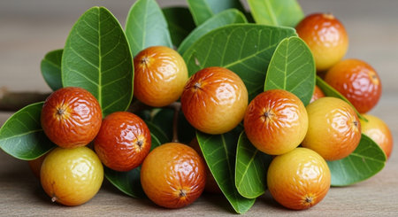 bunch of Thai fruits (Thai name Mafia) that have both. Sweet and sour taste on wooden floor.