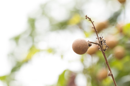 Longan ripe fruits (Dimocarpus longan) and a bee, in shallow focus