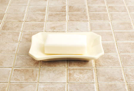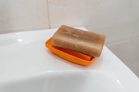 Bar of soap on the sink close-up. Soap lies on a sponge in a soap dish