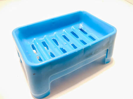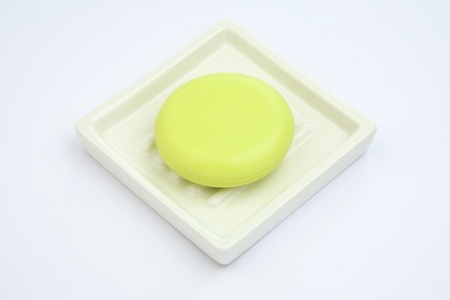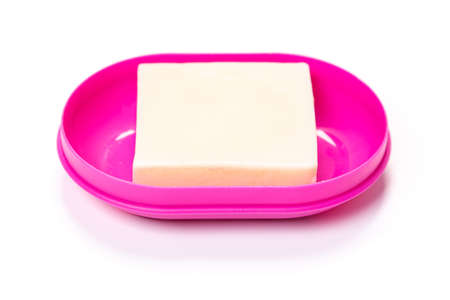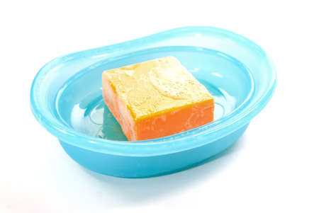 Soap in PLASTIC COLORED soap dish isolated on white background