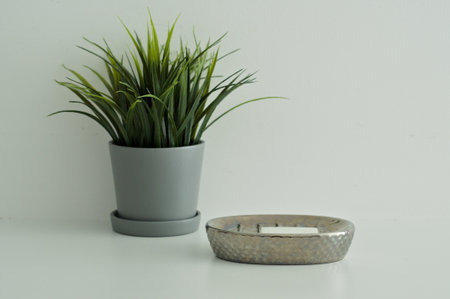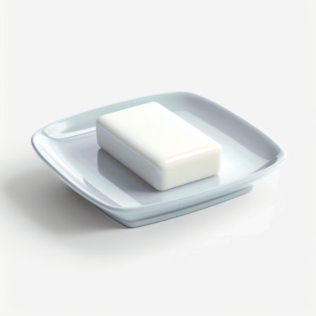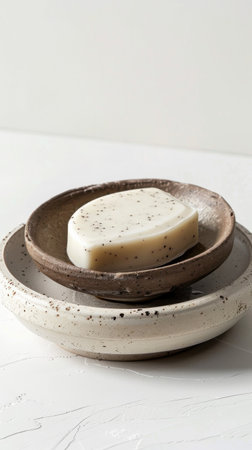 bold flat lay of handmade soap bar on a ceramic base, with ivory and gold colors, soft overhead lighting radiance, soothing textures, high resolution