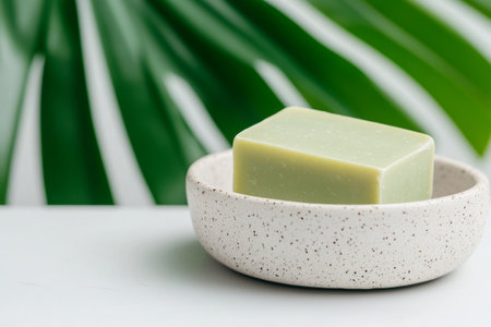 Handmade soap placed in a ceramic dish, set against a backdrop of lush green leaves