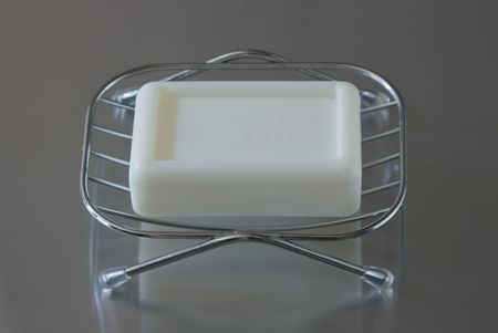Glass soap dish with chrome base, attached to the bathroom wall. Bathroom details. Solid soap, hand hygiene.