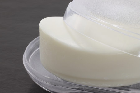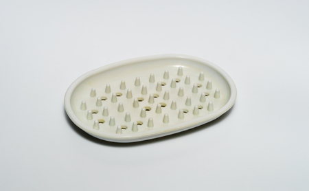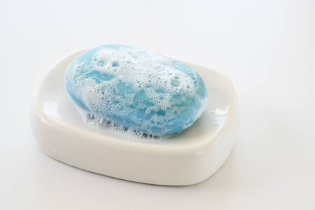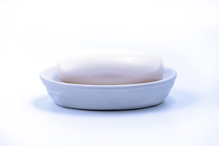 Soap in soap dish isolated on a white background. Flat lay, top view