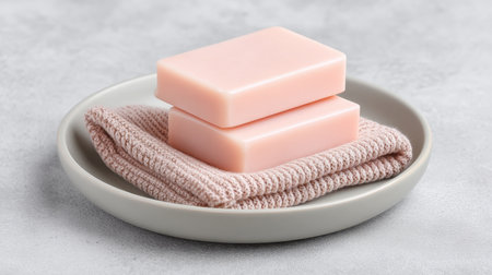 This image features soft pink soap bars neatly stacked on a neutral plate alongside a cozy washcloth. Ideal for spa themes, bathroom decor, or self-care imagery.
