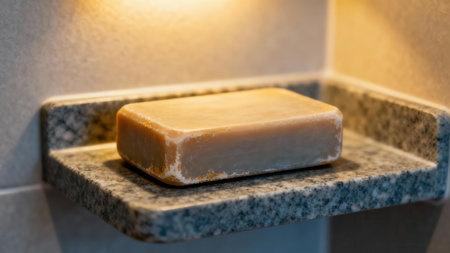 Close up of a slightly used rectangular piece of tan bathing soap sitting on a dark grey speckled granite corner shelf under soft, dramatic lighting.