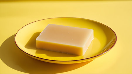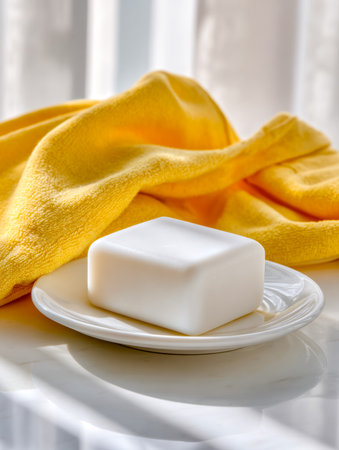 White soap bar placed on a pristine plate, set against a cheerful yellow fabric that evokes warmth and freshness.