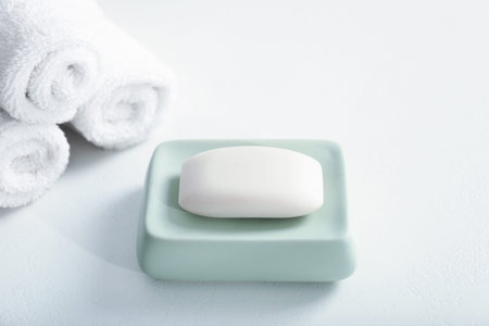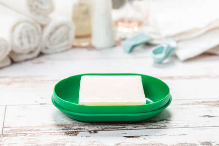 new soap on a green soap dish, on a white wooden background. hygiene concept
