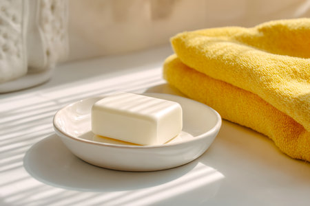 A bar of soap in a dish, with yellow towels nearby, creating a clean and inviting atmosphere.