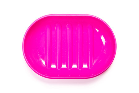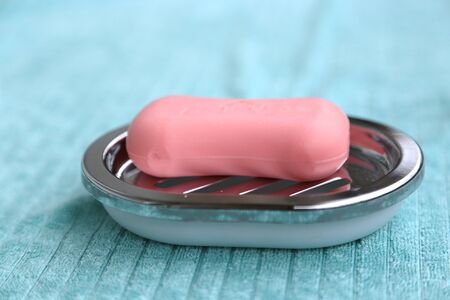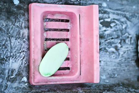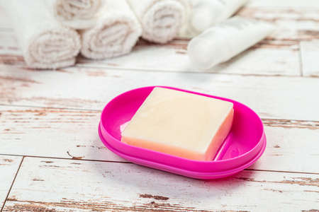 soap on a pink plastic soap dish in the bathroom on a wooden table