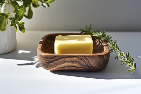 Butter block in wooden dish with fresh rosemary and sunlight.