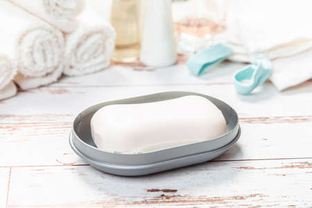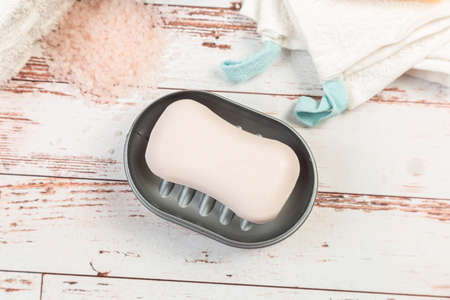 soap on gray plastic soap dish with towels on white wooden table in bathroom
