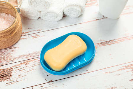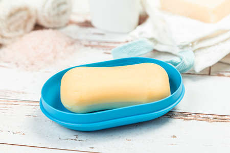 soap on a blue soap dish isolated on a wooden table. hygiene cleanliness travel concept