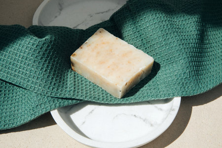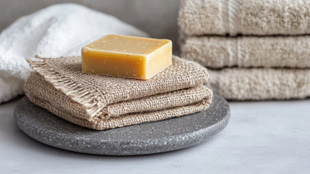 Natural soap on decorative stone plate with towels arranged in a calm, minimalistic bathroom setting
