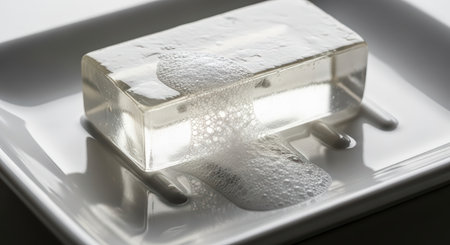 Enhancing hygiene close-up of a bar of soap with bubbles on a wet surface home bathroom environment high-quality image