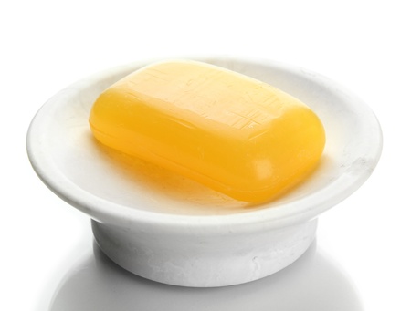 A bar of soap in a soap dish. Close up. Isolated on white background.