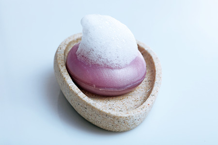 Soap bar in foam with copy space in center isolated on bright pink background.
