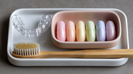A tray with a toothbrush, a tray with a tray of colorful pills, and a tray with a tray of a clear tray with a tray of a tray with a tray of a tray with a tray of a tray with a tray of a tray
