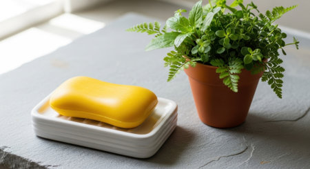 A vibrant yellow bar of soap rests in a white ceramic dish. Beside it, a small potted plant with verdant green foliage adds a touch of nature.