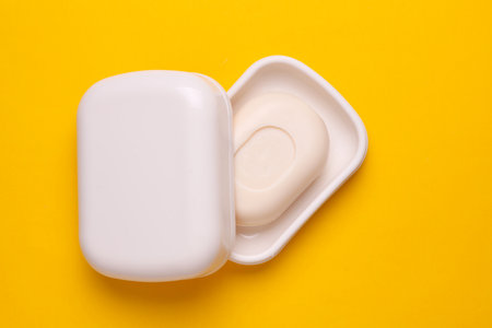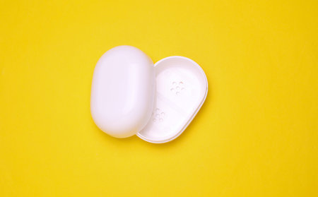 A piece of white soap on a transparent stand on a yellow background. Protect against the coronavirus. Coronavirus pandemic protection by washing hands frequently.