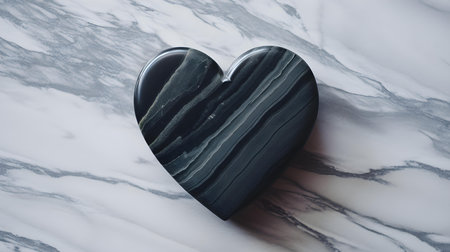 Top view of an anthracite heart on a white marble background. Romantic backdrop with copy space