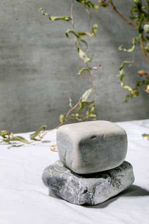 Abstract natural scene with geometrical texture stone as podium or pedestals for products presentation or exhibitions on white textile with branch decor. Scene to show any products for advertising.