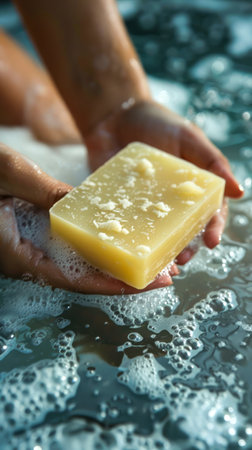 Enhancing hygiene close-up of a bar of soap with bubbles on a wet surface home bathroom environment high-quality image