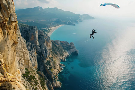Paraglider flying over the ocean. Paraglider on the background of the cliffs.