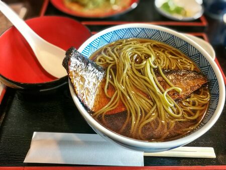 Soba noodle with fried fish for lunch at local restaurant in Kyoto, Japan.