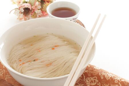 Japanese Cha Soba (Green tea Soba) in dish - Selective focus point