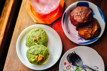 White chocolate matcha and Chocolate brownie brownies cookies in plate and iced red soda on wood table.