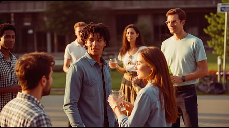 Group of diverse friends enjoying a sunny day in a park, laughing and chatting together