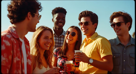 A cheerful group of friends relaxing on a beach, holding drinks, wearing sunglasses and summer attire, enjoying a sunny day.