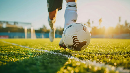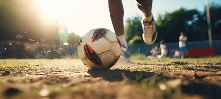 player playing soccer with ball, close up of foot and ball on green grass, by ai generative