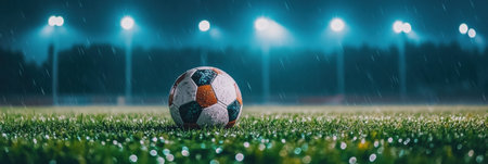 A soccer ball rests on a dewy grass field, illuminated by dramatic stadium lights in a rainy evening atmosphere with a clear space for text.