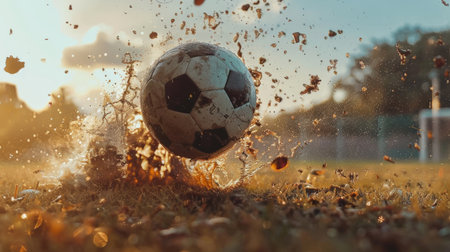 Dynamic view of a soccer ball being kicked, blurred grassy field and action in the background. AI generated.