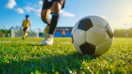 Concept illustration of close-up of a soccer ball on the grass, a player in the background is preparing to kick it. Sports concept.