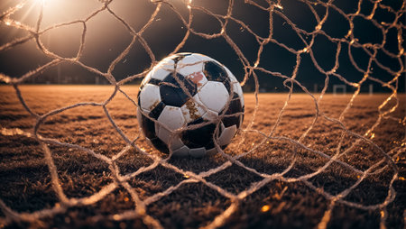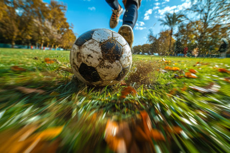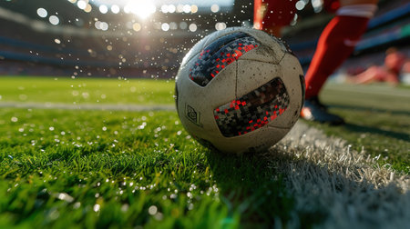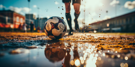A muddy soccer ball rolls across the wet pitch during an intense match in the stadium surrounded by cheering fans. Generative AI