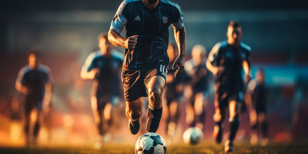 Exciting soccer match captured at night with a player focusing on the ball on a vibrant field surrounded by cheering fans. Generative AI
