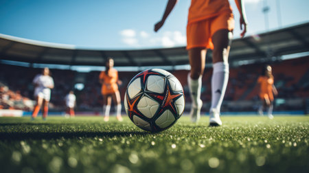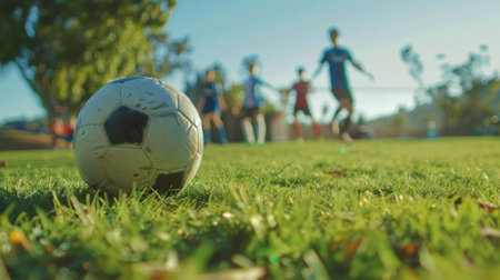 A close-up of a soccer ball rolling through the grass during an outdoor match in bright daylight. Generative AI