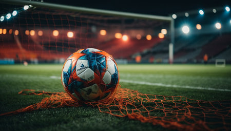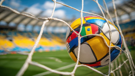 Close-up of a colorful soccer ball caught in the net of a goal, with a blurred stadium in the background.