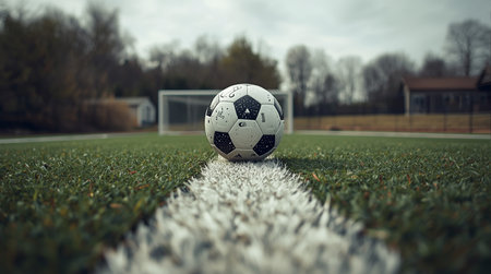 Soccer ball rests on the green grass of the field with the white boundary line in the foreground, embodying the spirit of the game