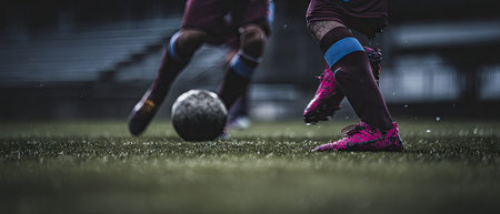 This image presents a close-up of soccer players' feet and a ball on green grass. The composition emphasizes action, with players seemingly engaged in a match. Visuals showcase muted colors, hinting at a cool tone. This image may be suitable for commercial uses in sports, fitness, or activity-related projects.