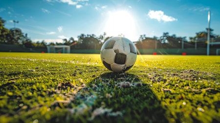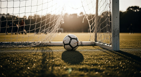 Soccer ball rests near goalpost on vibrant grass field, with warm sunlight creating an inviting atmosphere, showing the excitement of outdoor sports