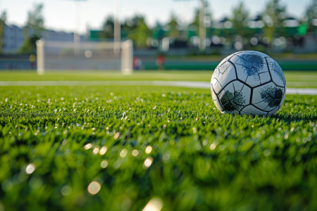 Detailed close-up of a soccer ball resting on the lush green grass of a sunlit pitch, ready for an exciting game to begin.