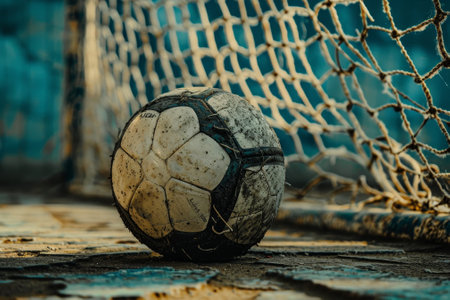 A dirty soccer ball is sitting on the ground next to a net. The ball is black and white, and it is worn and battered. Concept of wear and tear