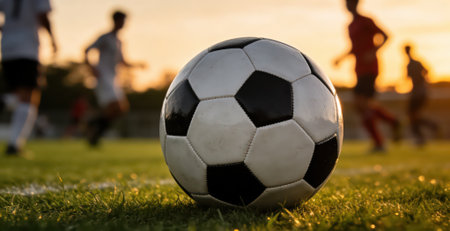 Soccer ball on the field with players in the background at sunset