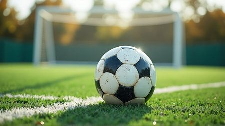 A soccer ball rests on a green field illuminated by sunlight. The scene showcases a close-up perspective of the grass texture and white field lines, with a soft focus background of trees. The image conveys a sense of calm and could be used for sports, leisure, or recreational themes.