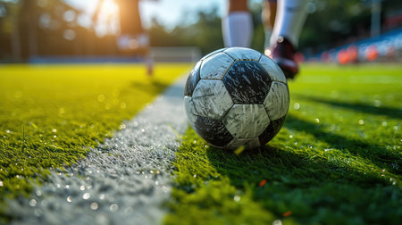 Old soccer ball on a football field : Generative AI