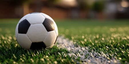 Close up of a black and white soccer ball next to a white line on a green pitch. Football Background